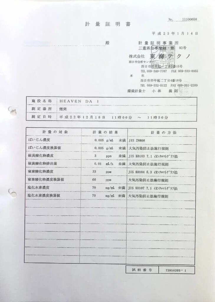 火葬装置に関するダイオキシン、窒素酸化物、いおう酸化物などの対汚染物質の測定については財団法人日本文化用品安全管理試験等で行っております。その結果、発生数値が極めて低い測定結果が出ております。
